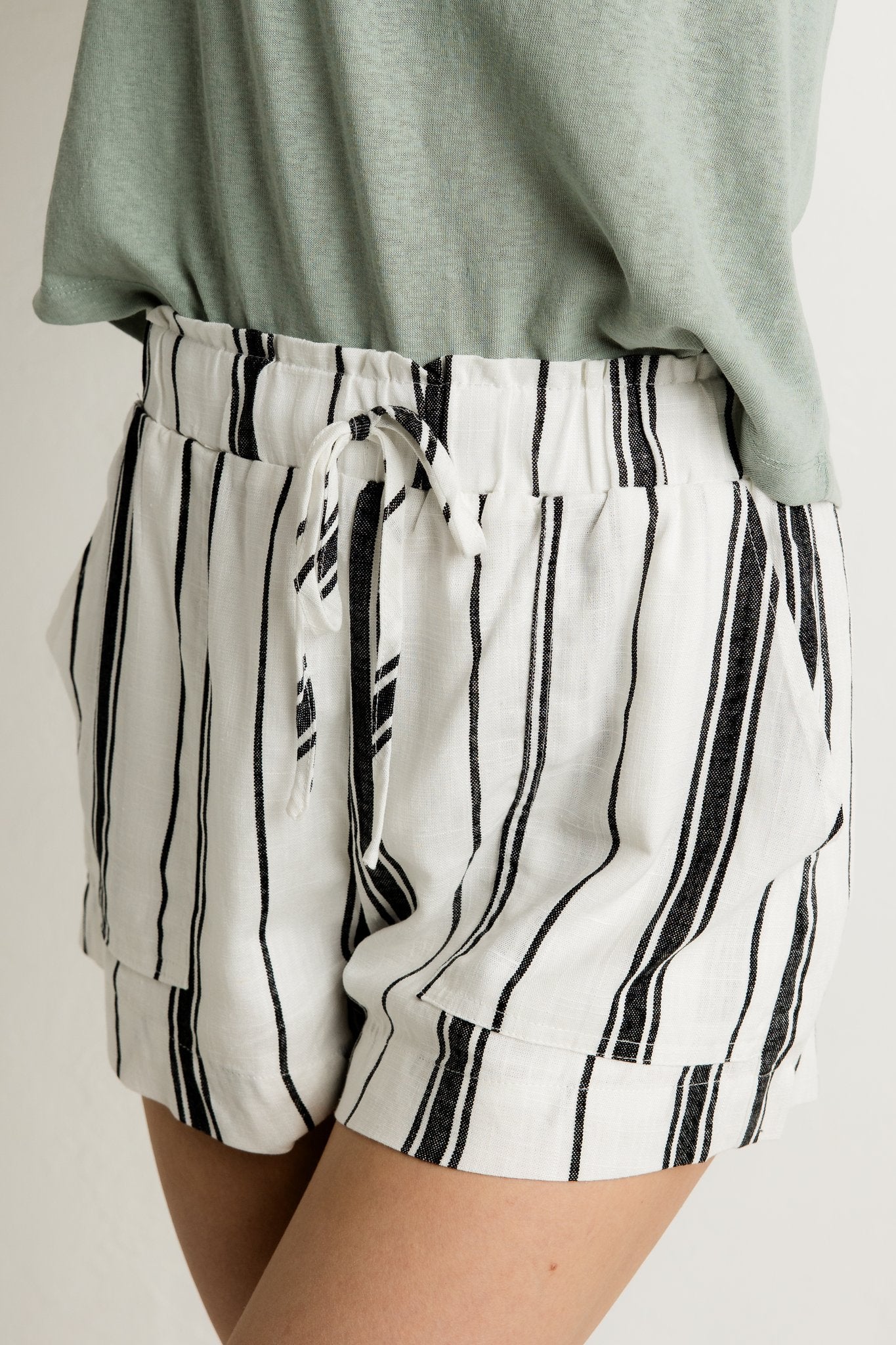These striped shorts are a comfortable material and have two front pockets. (Non adjustable drawstring). These are great for everyday wear or even a swimsuit cover-up.