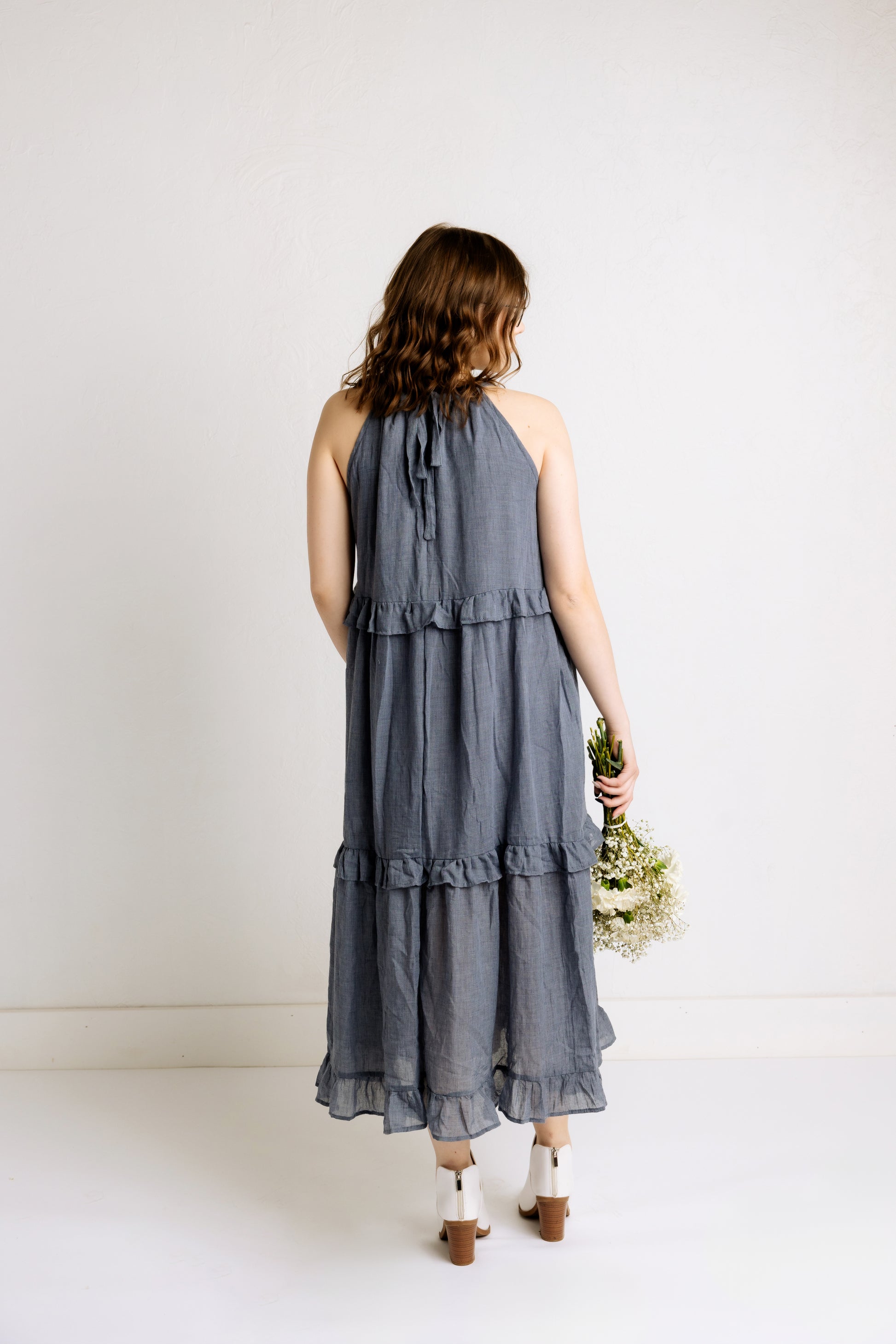 Our Halter Neck Maxi Dress in Denim Blue features a knee length lining, a tiered skirt, smocked bodice detailing, pockets and adjustable halter tie straps.