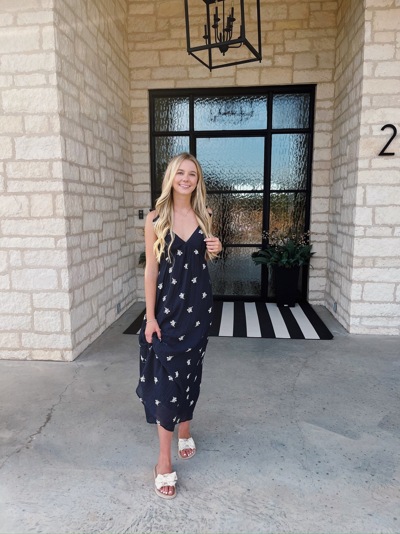 This color and fit doesn’t get better for summer. This dress offers a deep v neck, flutter sleeves, and embroidered details and full length lining.