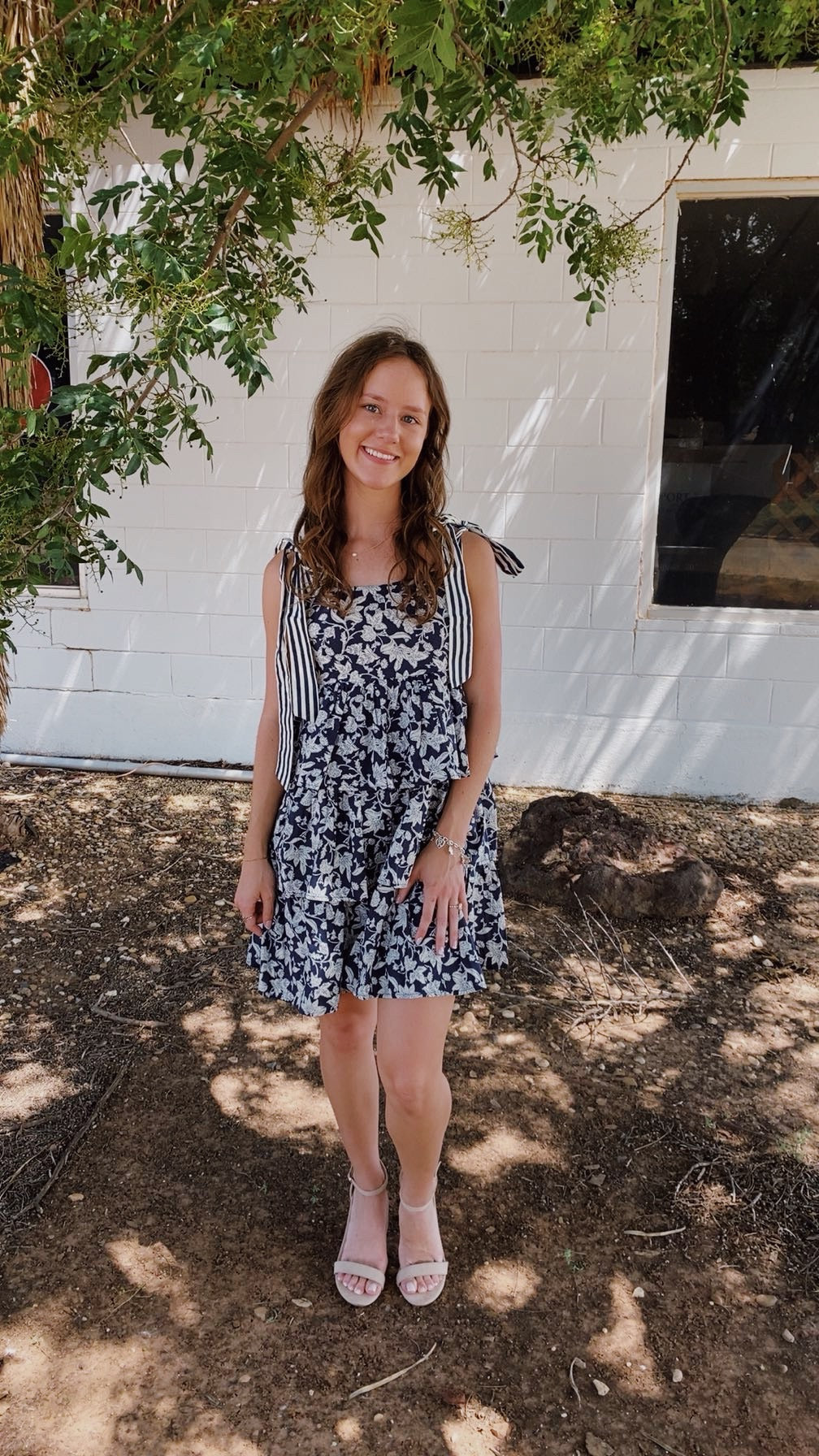 This navy ruffle mini dress has the cutest striped strap detail. It also features a zipper on the side, layered ruffles, and a smocked back on the bodice.