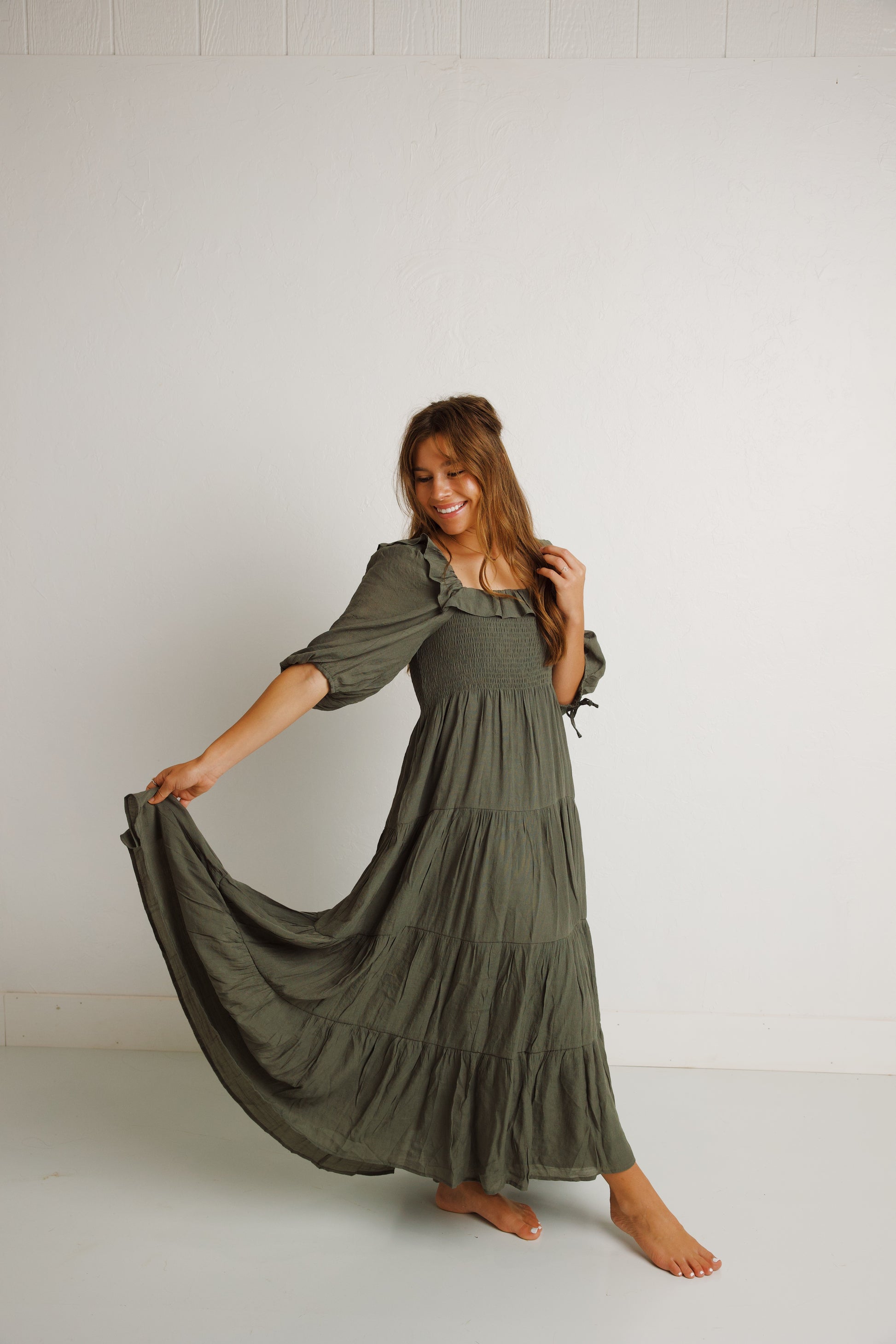 This boho dress would be beautiful for family photos or any special occasion you may have coming up. She offers a smocked bodice, 1/2 length sleeves, a cute ruffle around the neckline and a tiered skirt. She’s STUNNING on every body type.