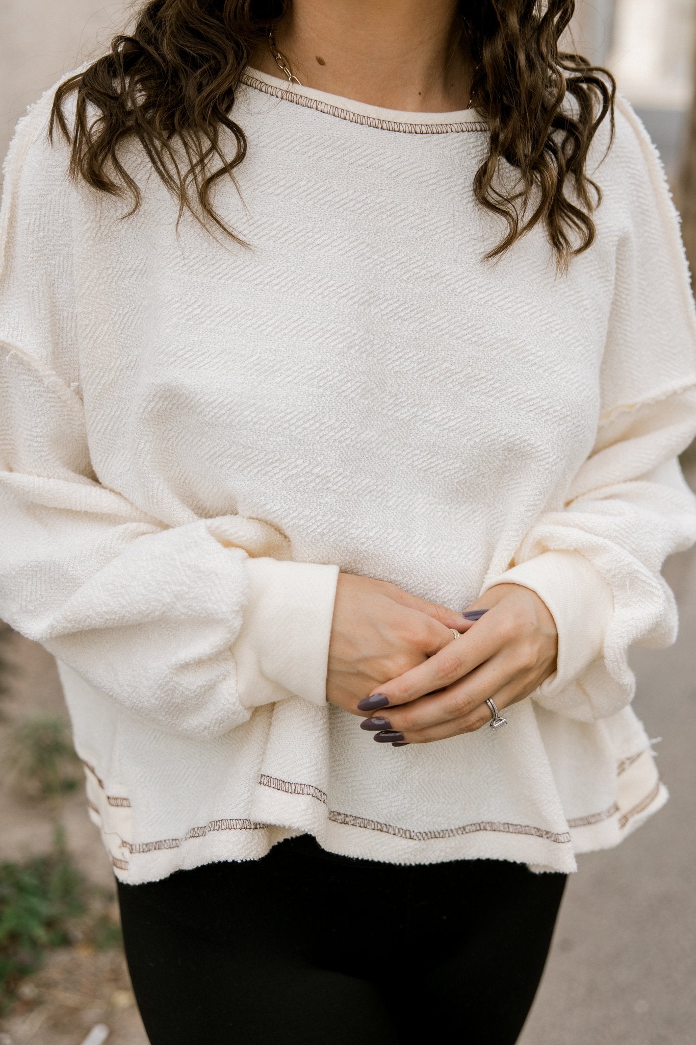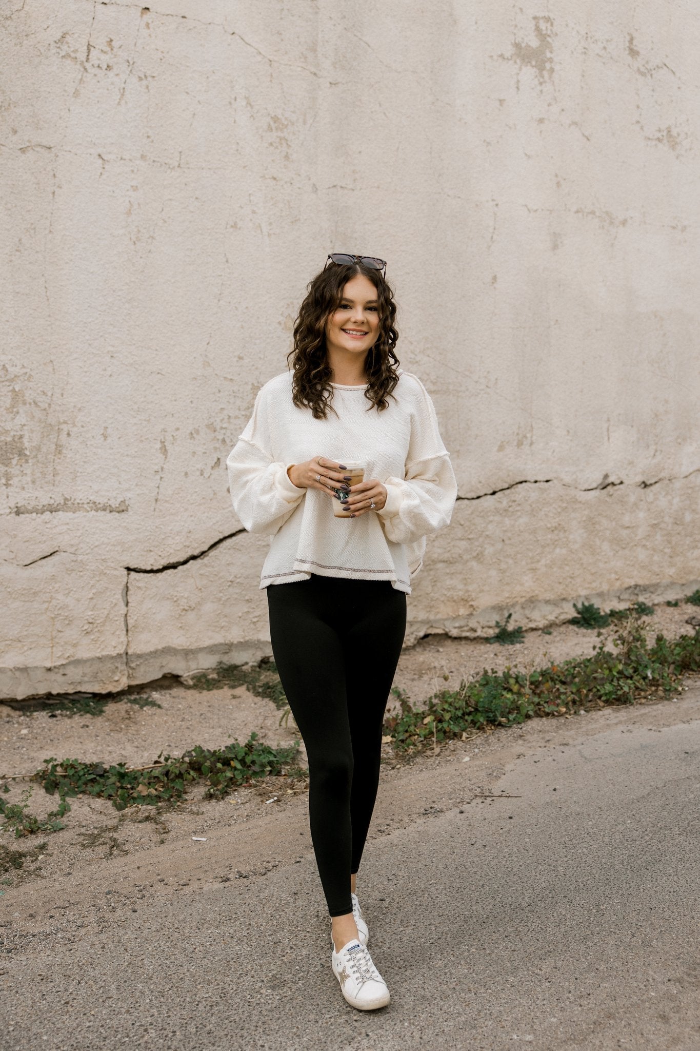The open back stitched top is such a cute top paired with our espresso leggings. Model is wearing size small. Runs TTS.