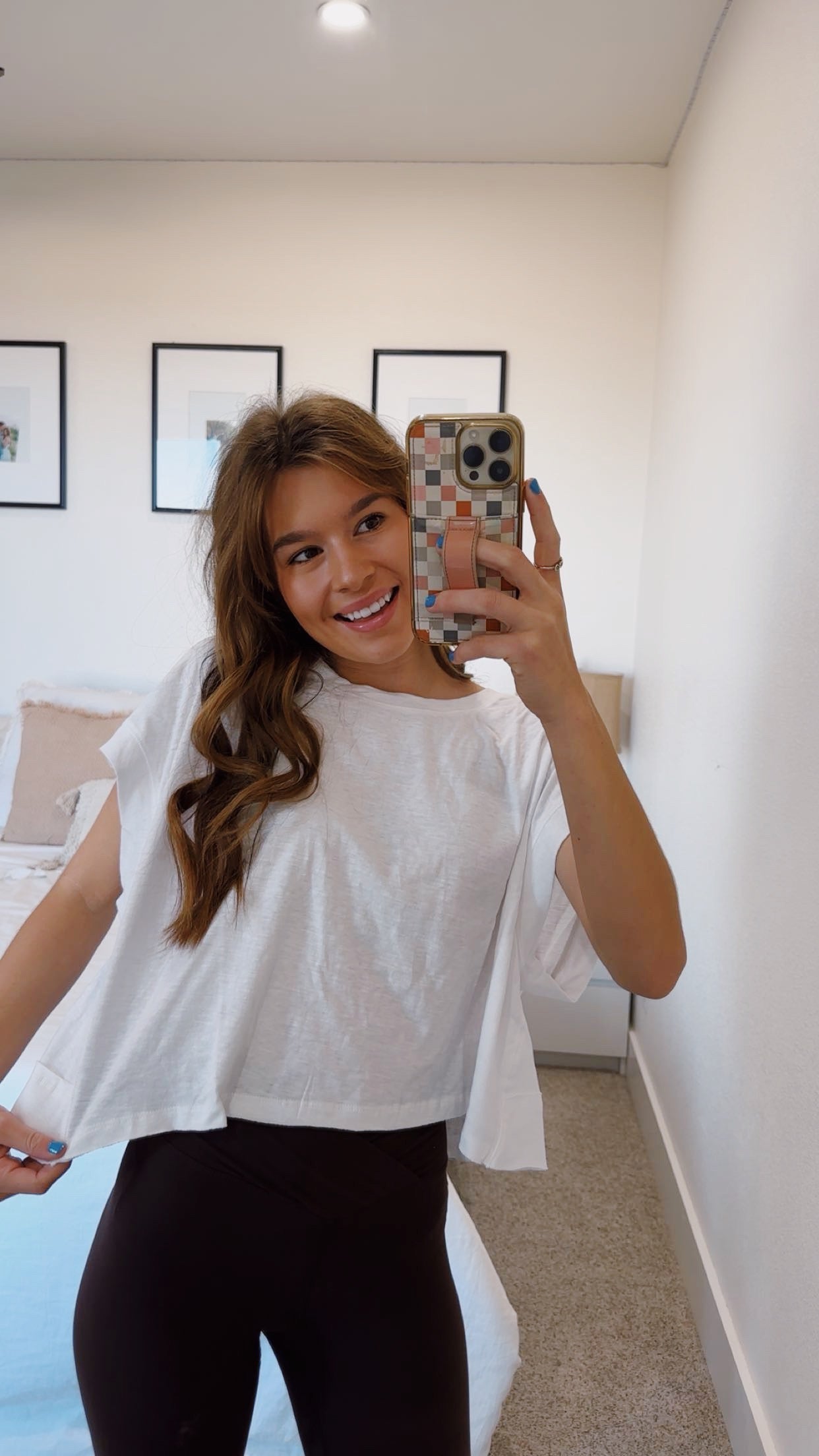 The white open back tee paired with our v-waist espresso leggings makes the cutest outfit for working out, running errands, or going to school