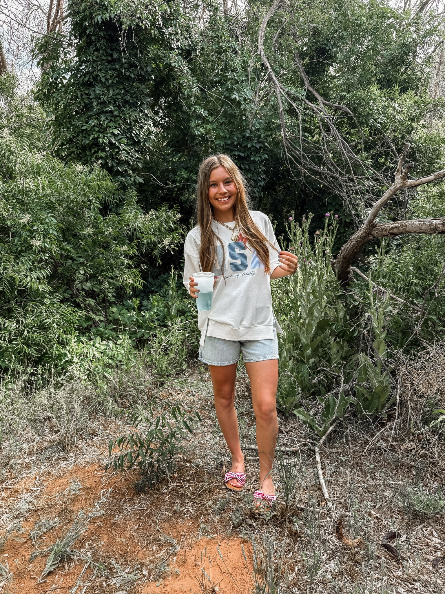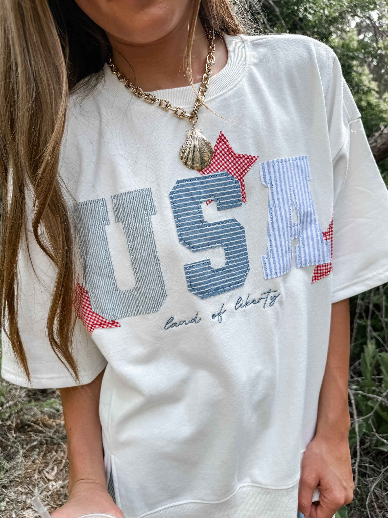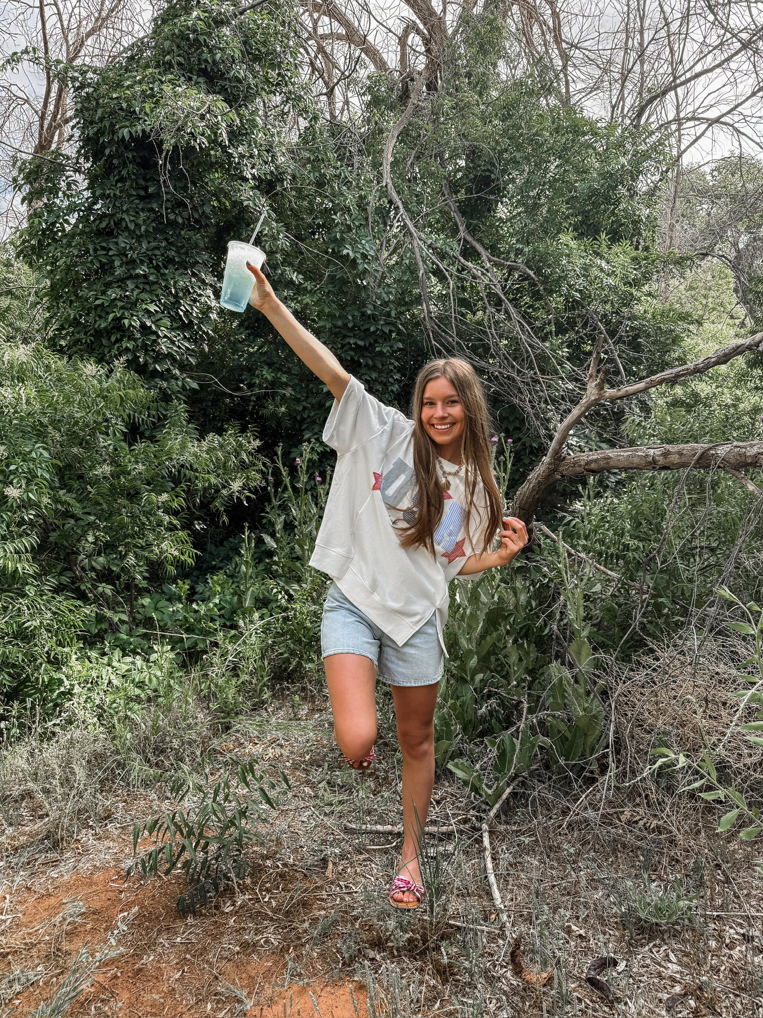 Be firework ready in this cute USA graphic tee. With these side slits you can give it a fun tuck and style with your favorite shorts, whether that be some cute boxer shorts or denim shorts, there’s so many fun ways to wear it!