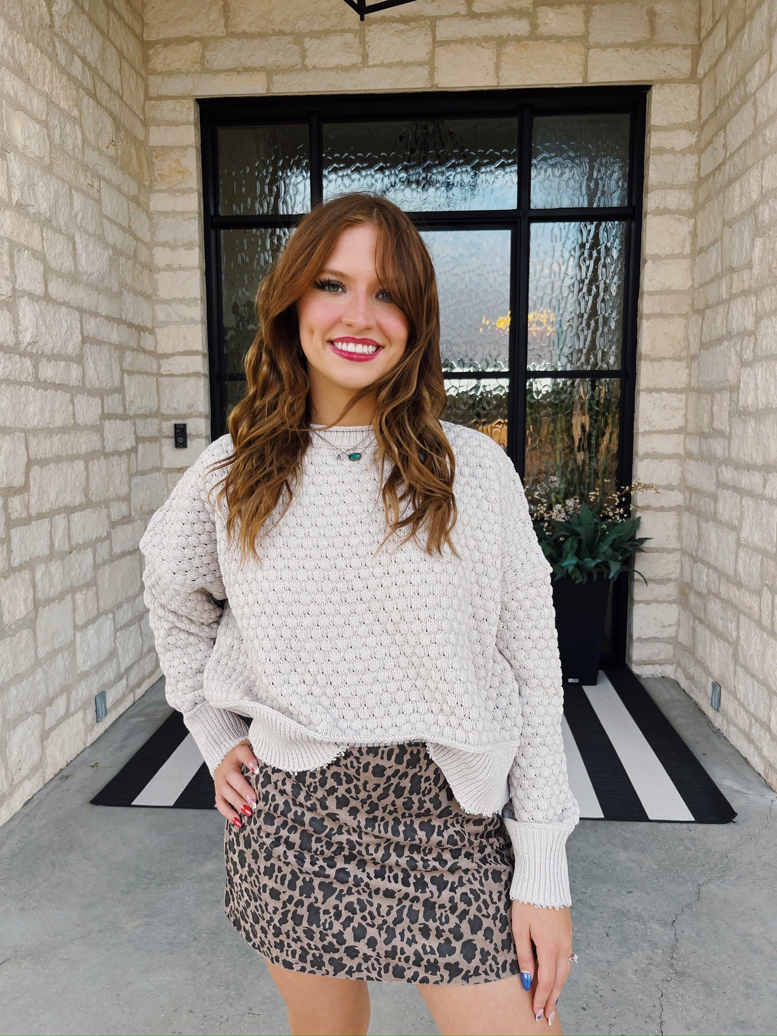 Our textured raw edge sweater is to die for! This creamy color styles well with so many items. She naturally fits oversized.
